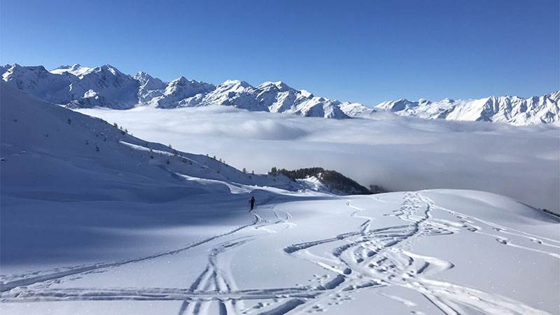 Con breve ripellata abbiamo infine ripreso la cresta e scelto la discesa vergine sul pendio a ovest che ci ha riportate in fondo alla valle sulle nostre tracce di salita, insieme a quelle di tutti gli altri.